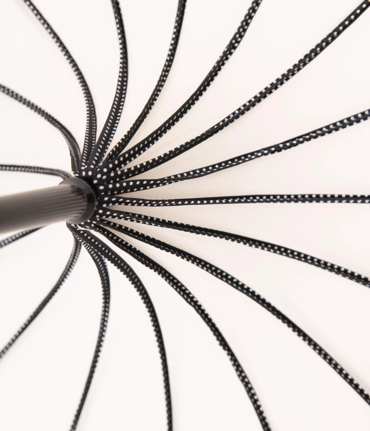 Some dots for the rain? Vintage old world charm and marvelous modernism create a striking umbrella that doubles perfectly as a parasol. A luscious ivory white pagoda roof is highlighted with black accents that are speckled with white polka dots. The 16 rib umbrella is outfitted with strong steel, equal parts fabulous and head turning. A distinctive black leatherette crook handle and manual open complete this retro stylish piece.