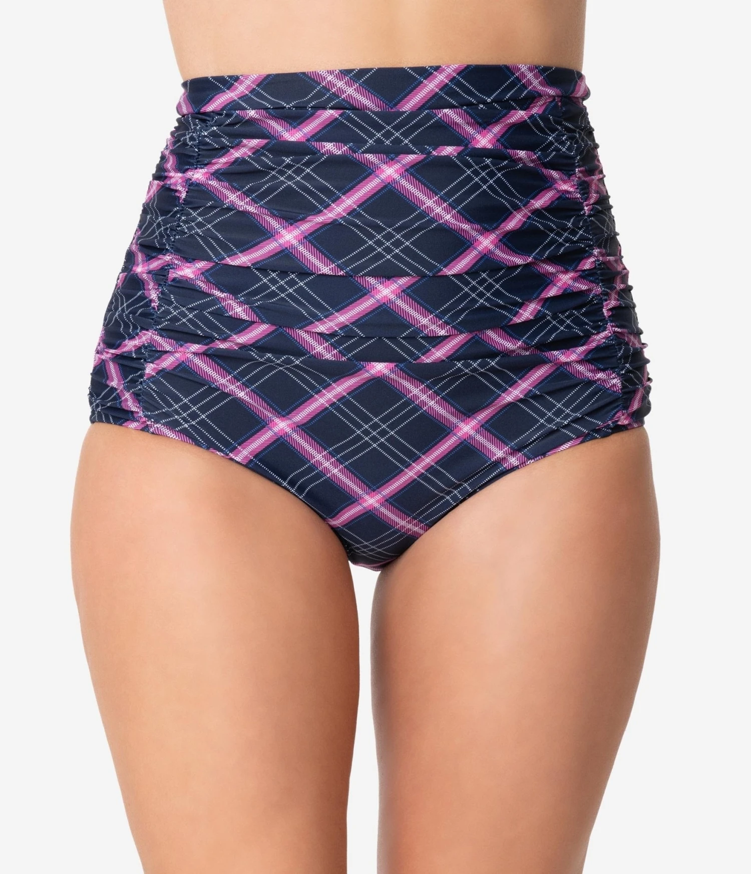 Unique Vintage Navy & Pink Plaid Monroe High Waist Swim Bottom