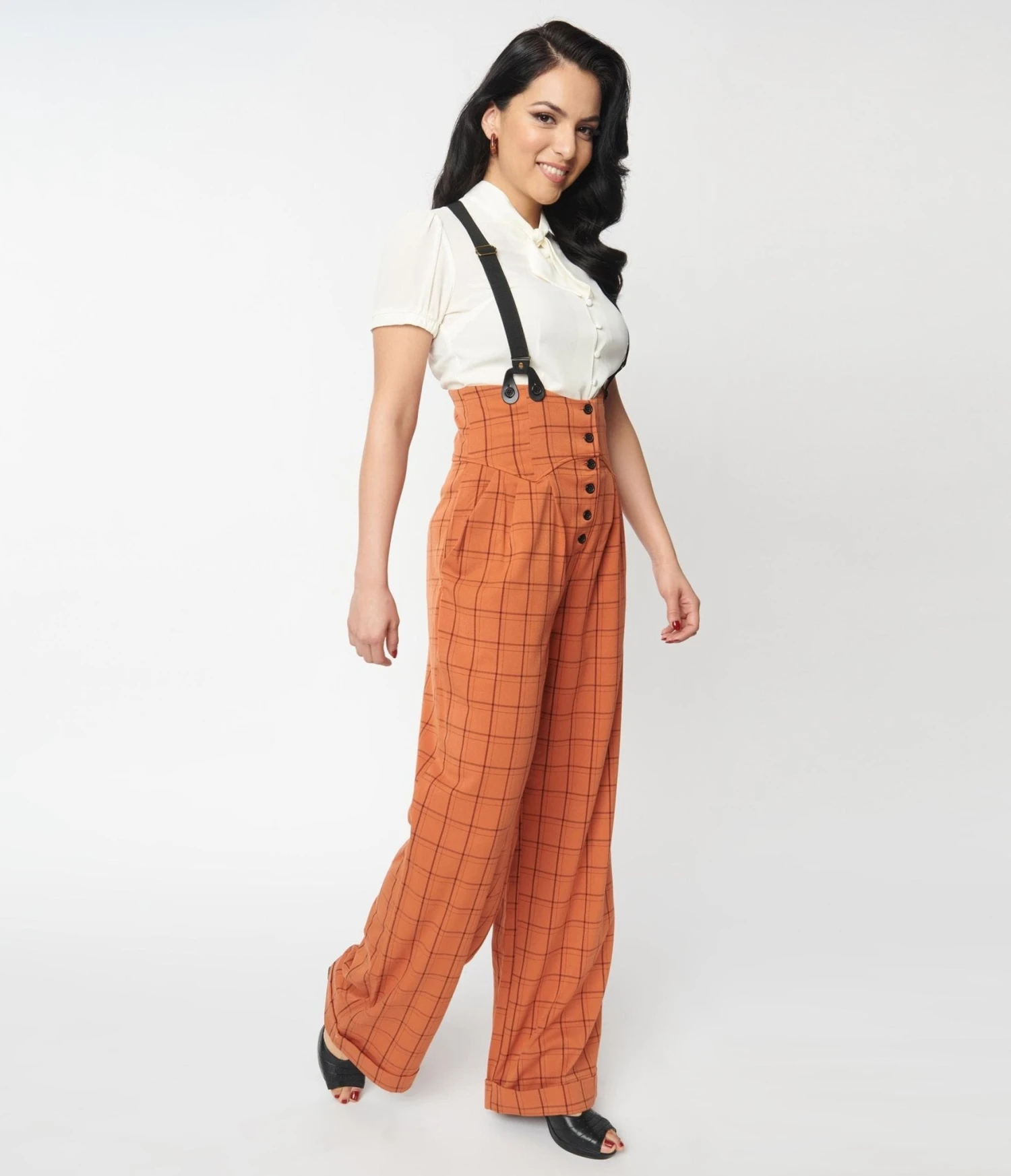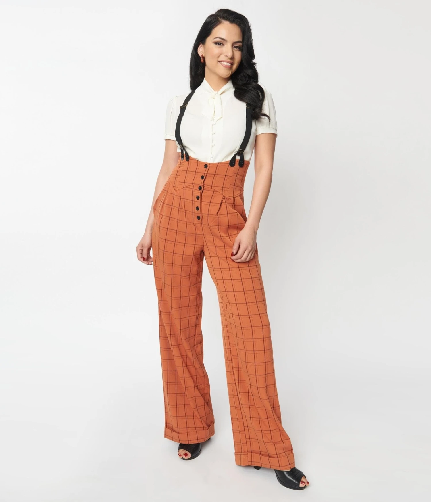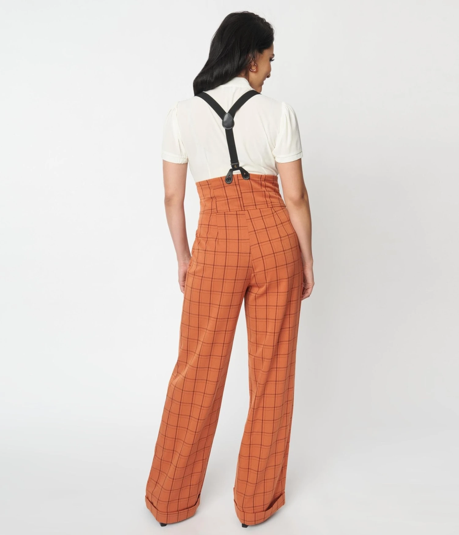 Be the first to review “Unique Vintage Orange Windowpane Thelma Suspender Pants” Cancel reply