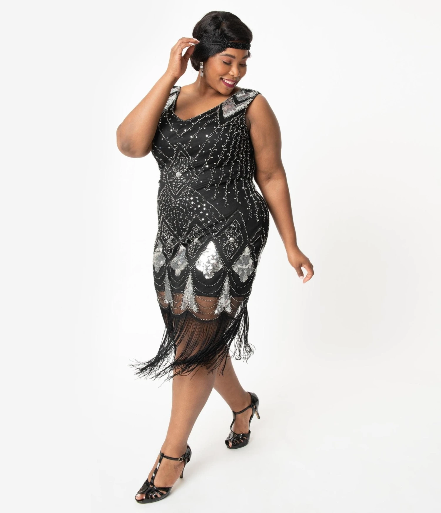 Unique Vintage Plus Size 1920s Black & Silver Sequin Lina Fringe Flapper Dress