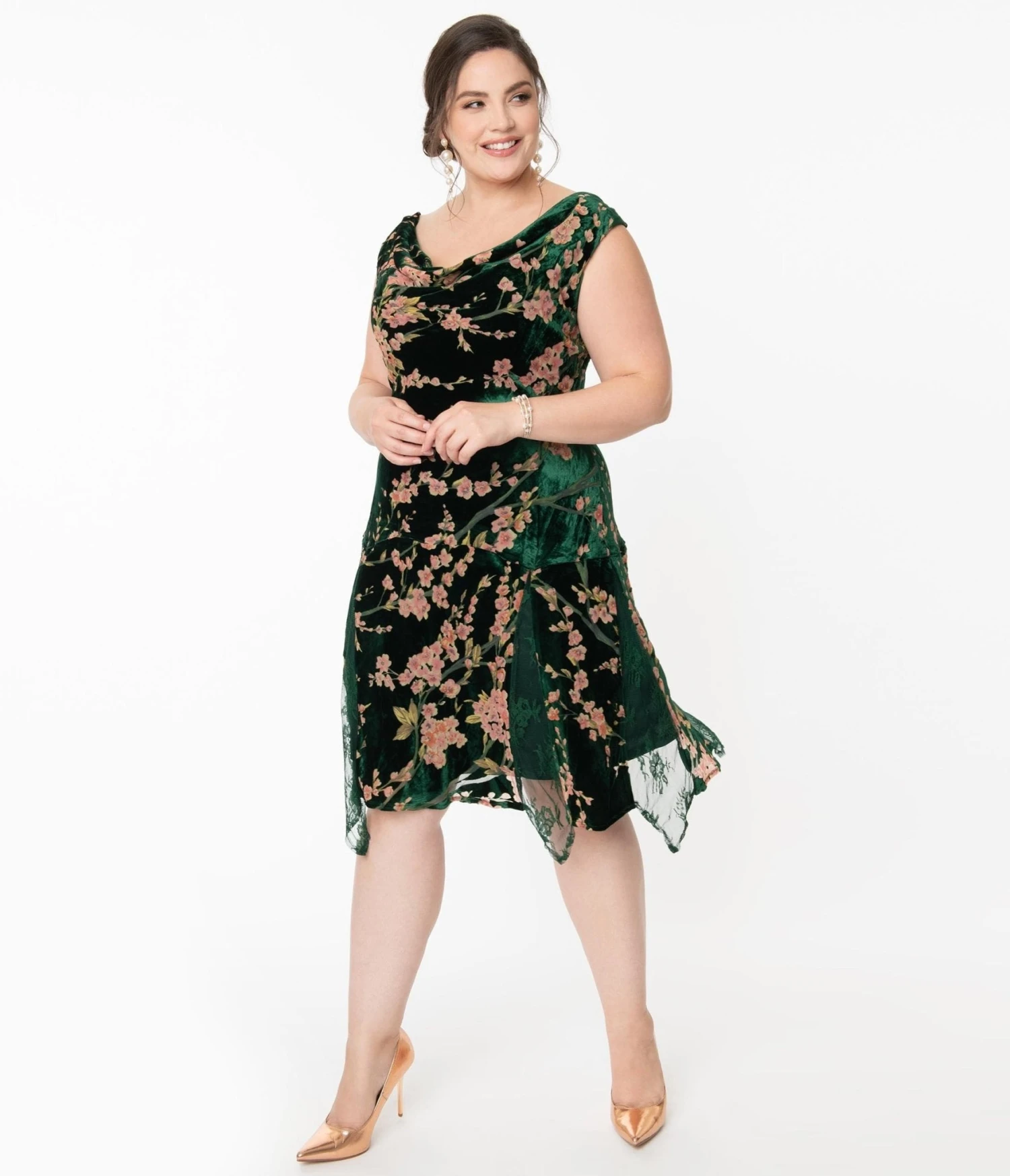 Unique Vintage Plus Size 1920s Emerald Velvet Floral Burnout Hemingway Flapper Dress