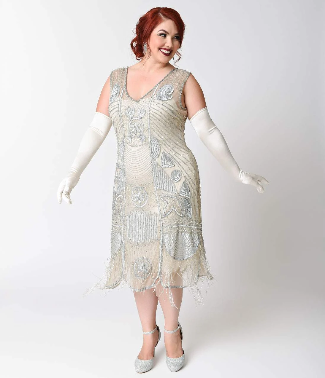 Sweet, sophisticated and undeniably sultry, The Plus Size Bosley silver beaded flapper dress from Unique Vintage is a true vintage recreation with a modern edge. Whether you’re looking for a unique dress for prom or homecoming or a perfectly retro frock to wear to a formal work event, this intricately decorated plus size 1920s-style dress is a stunning choice that will flatter any figure. Its shift shape is covered with elaborate art deco swirls, flowers and linear shapes made of soft silver beading, and it has a sheer silver mesh background that is meant to wear over a matching slip. A slight V-neck and lower V-shaped back create a modest neckline, beaded fringe dangles from the skirt and a scalloped hemline adds a uniquely vintage look that will make you feel just like a true flapper.