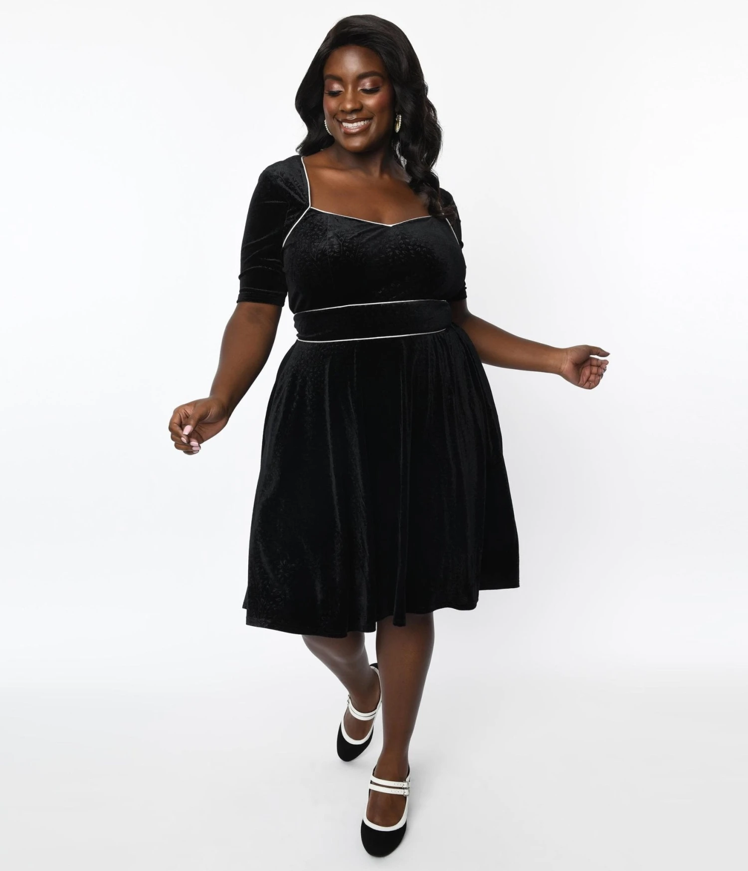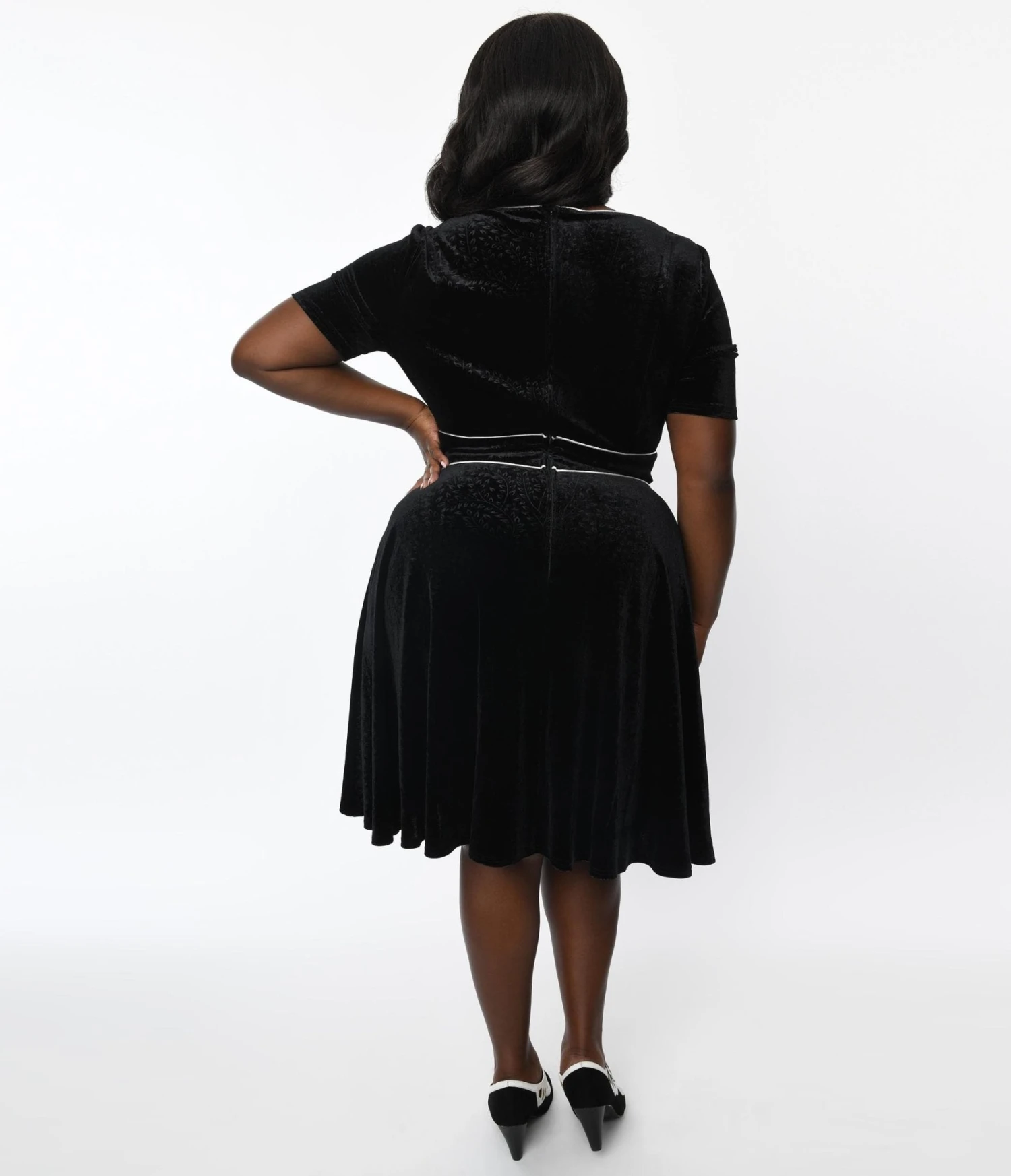 A sweet plus size black flare dress, crafted in velvet that dances with an embossed floral pattern throughout, accented with white piping. Complete with an illusion short sleeve bolero, side pockets, and a back zipper.