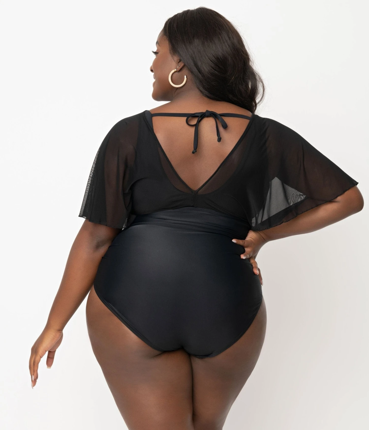 Unique Vintage Plus Size Black Mesh Sleeved Torrey Swimsuit