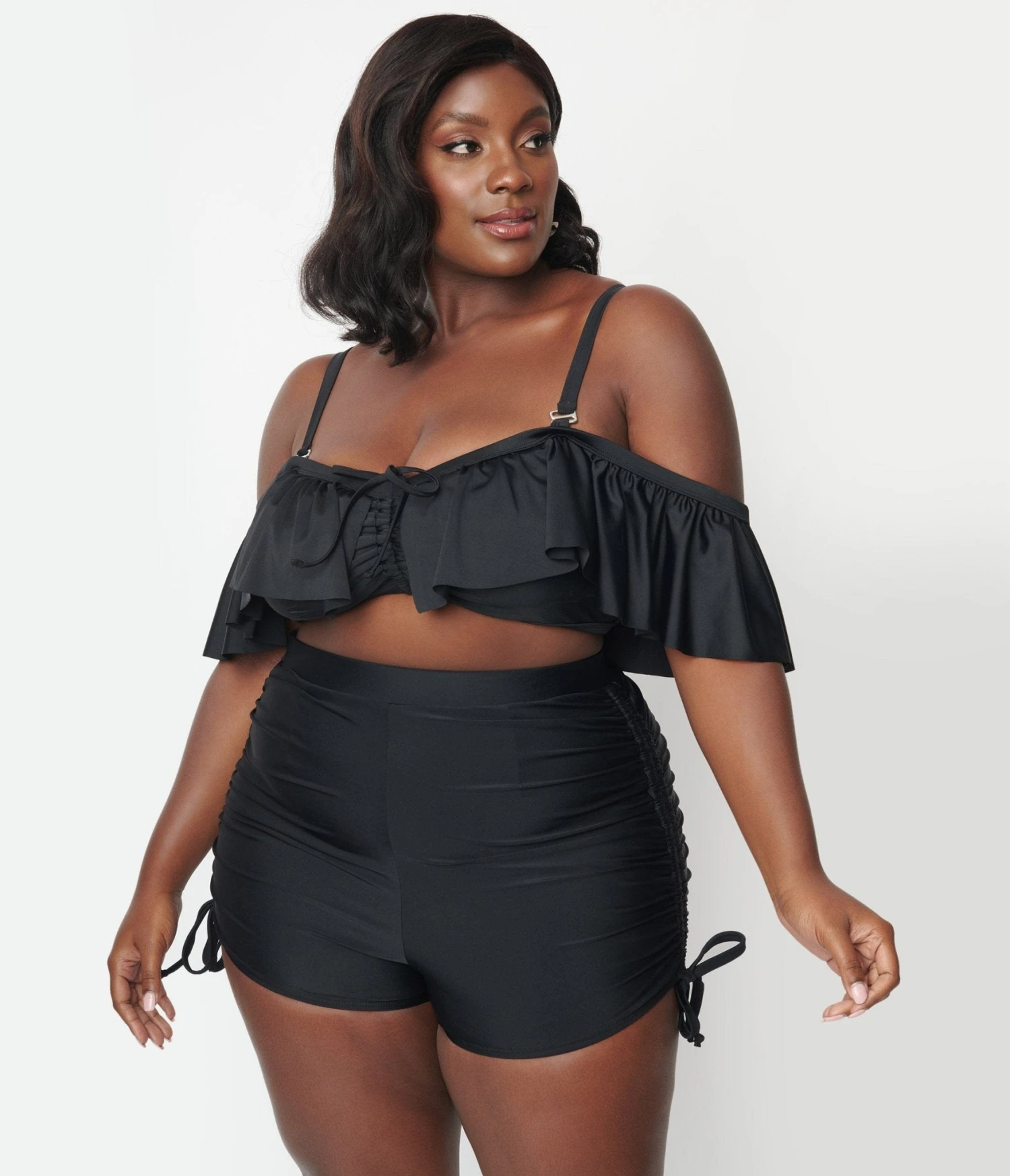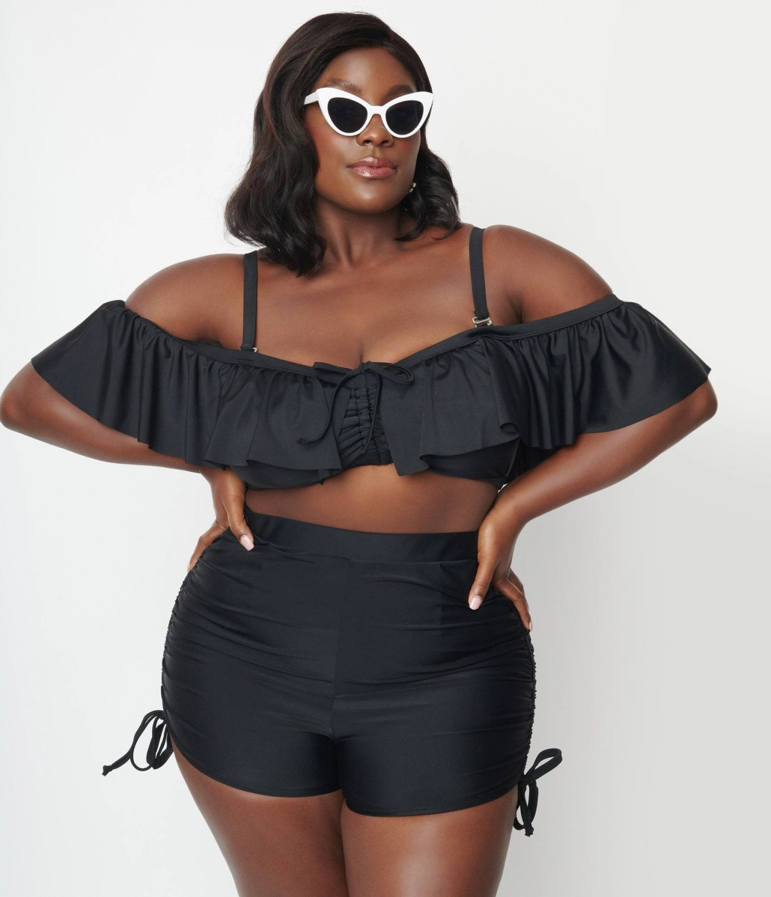 Unique Vintage Plus Size Black Pull Tie Swim Shorts