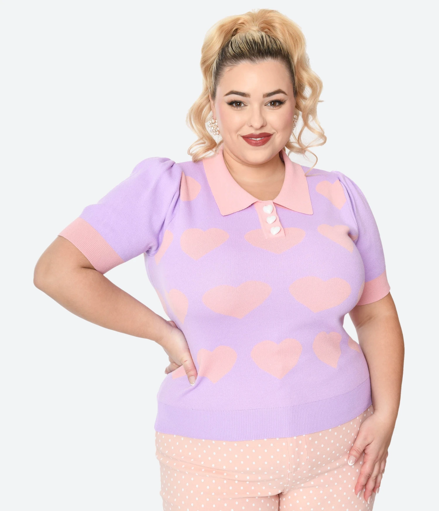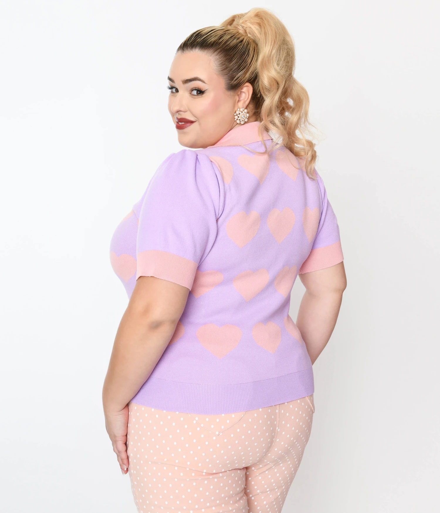 Unique Vintage Plus Size Lavender & Pink Hearts Short Sleeve Sweater