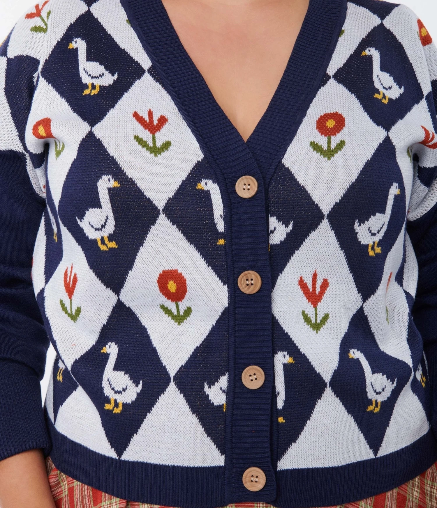 This charming plus size cardigan is crafted in a navy and white argyle pattern with sweet florals and ducks throughout. The button front leads to a V-neck and framed by three-quarter length sleeves.