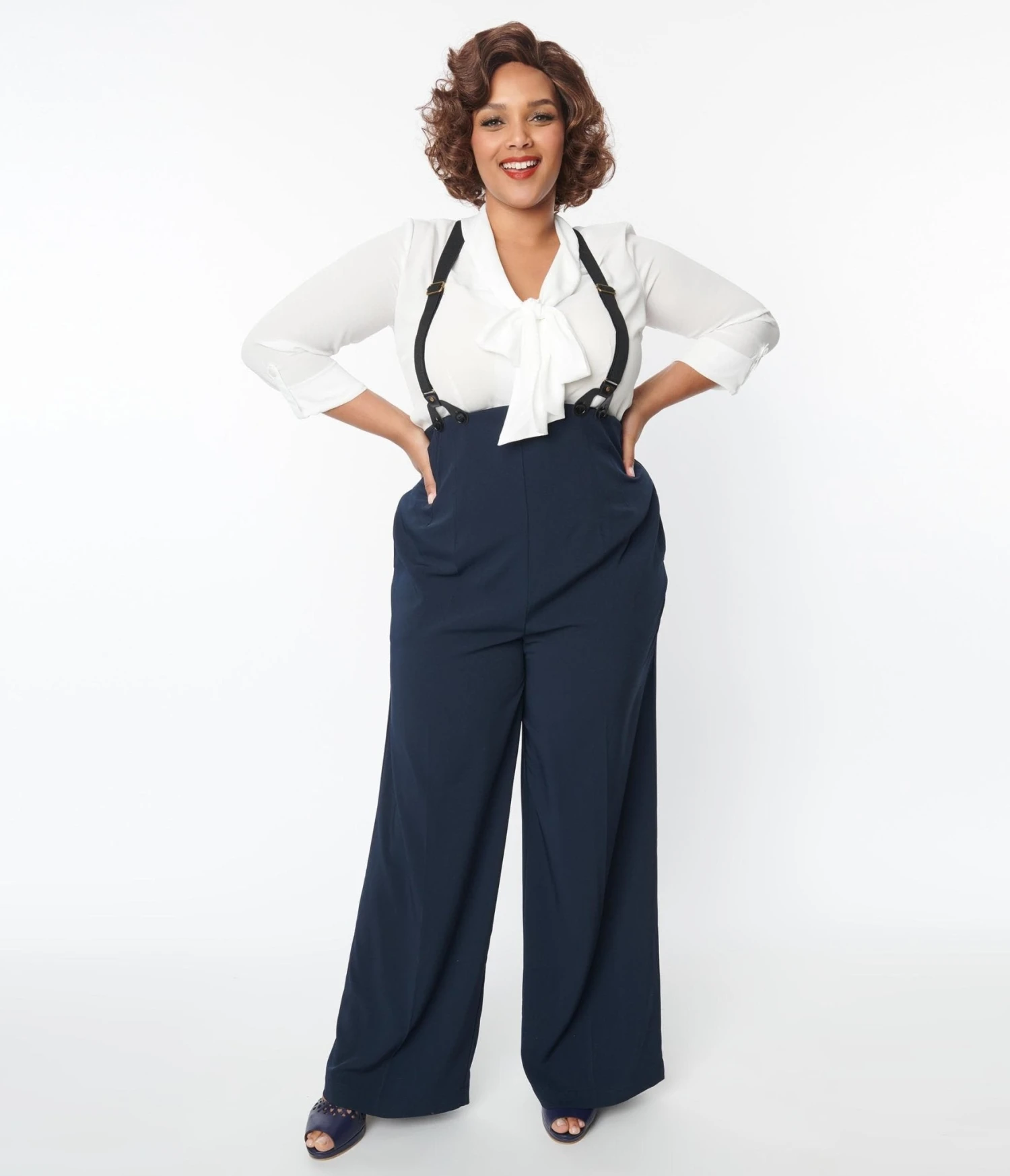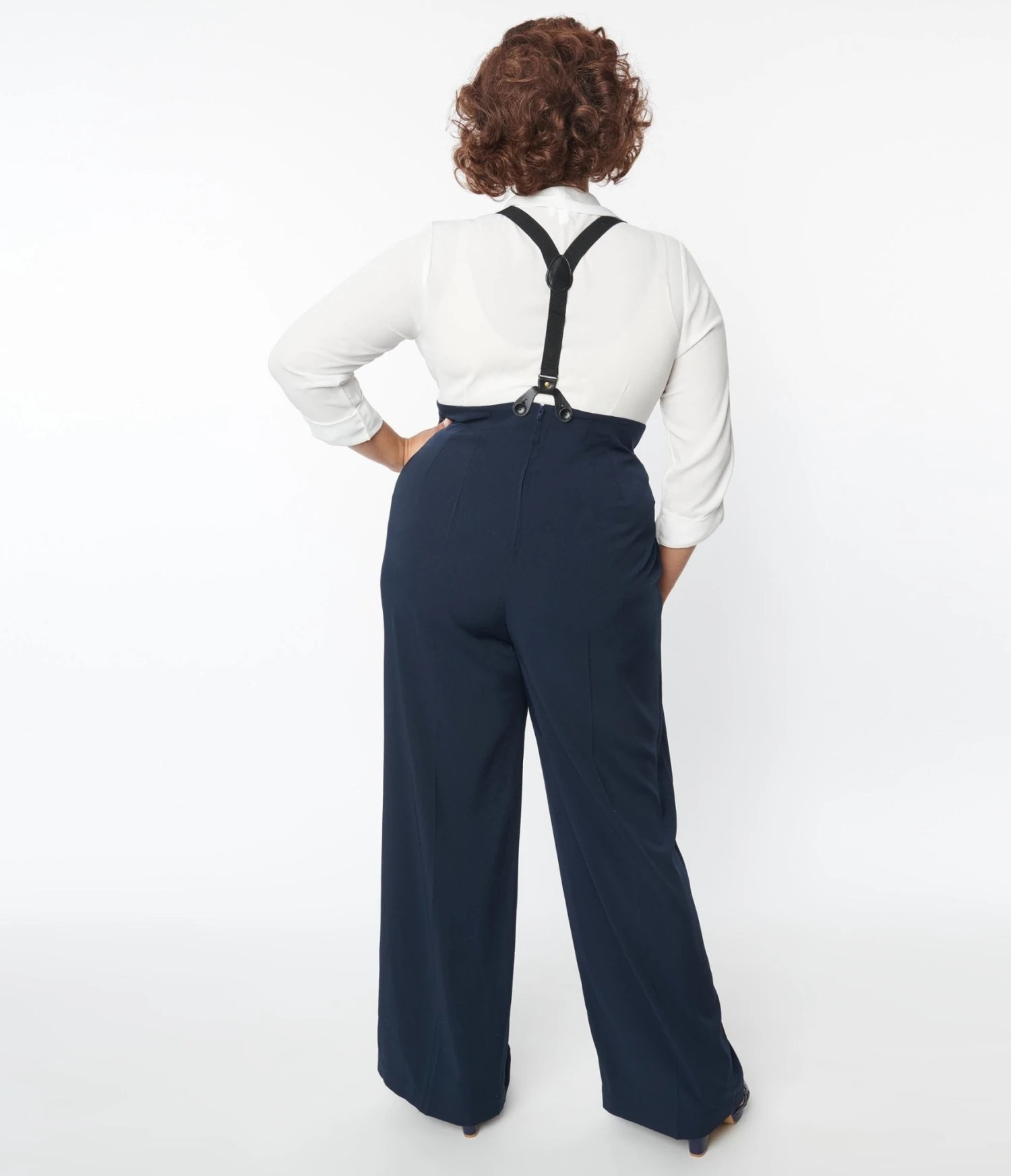 Unique Vintage Plus Size Navy High Waist Suspender Pants