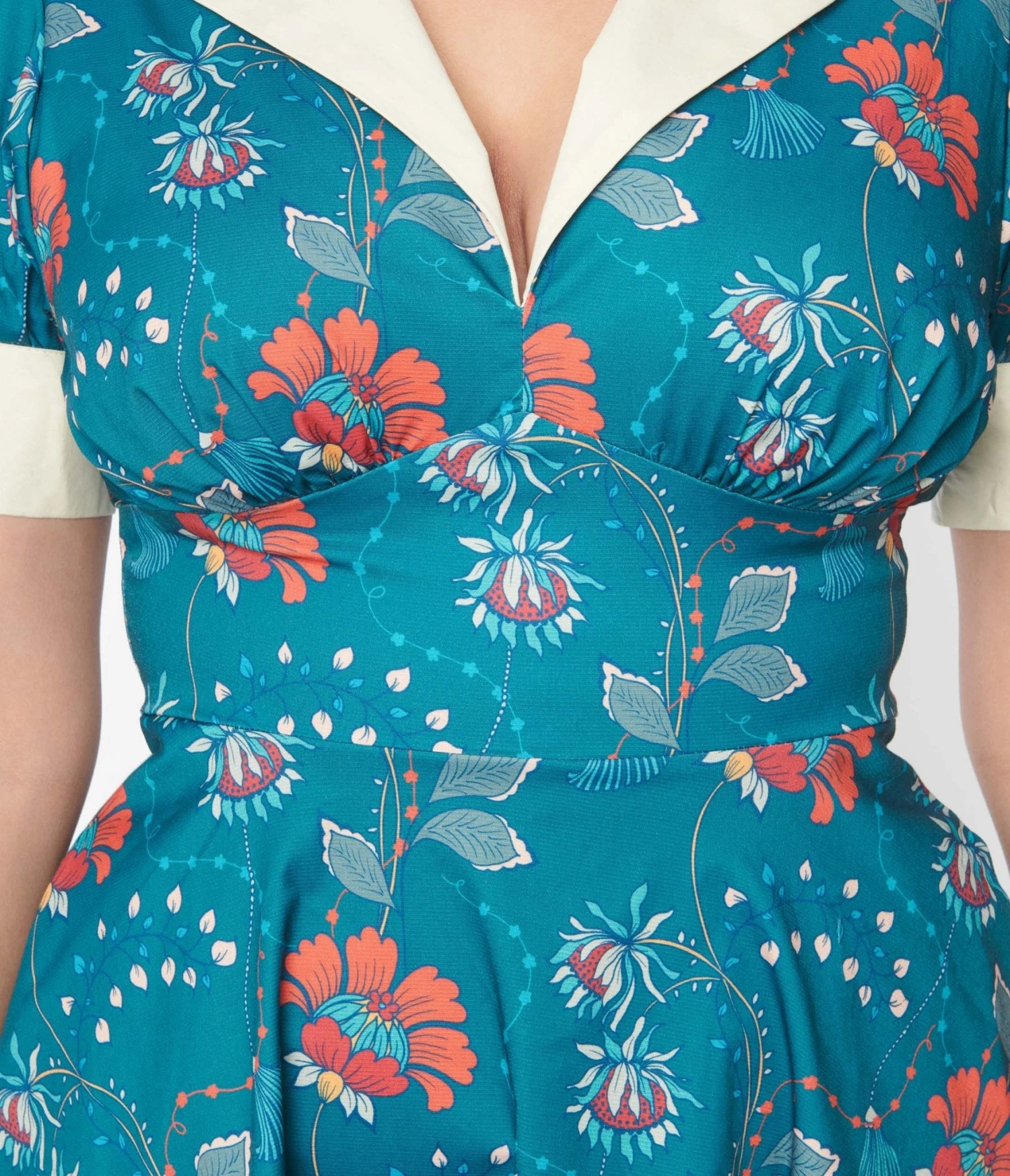 Unique Vintage Teal & Red Floral Chain Print Swing Dress