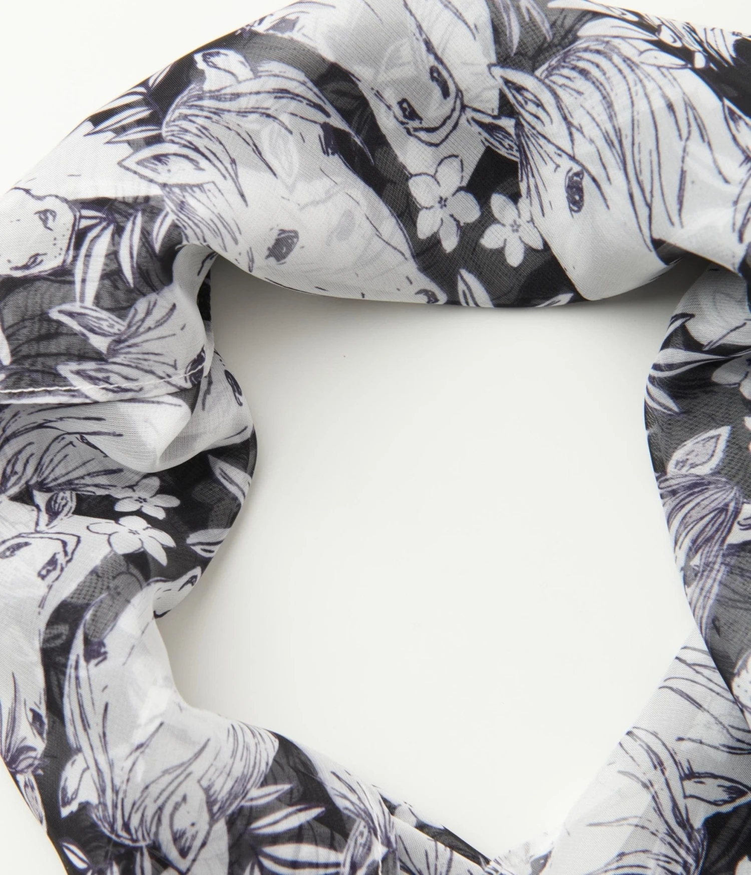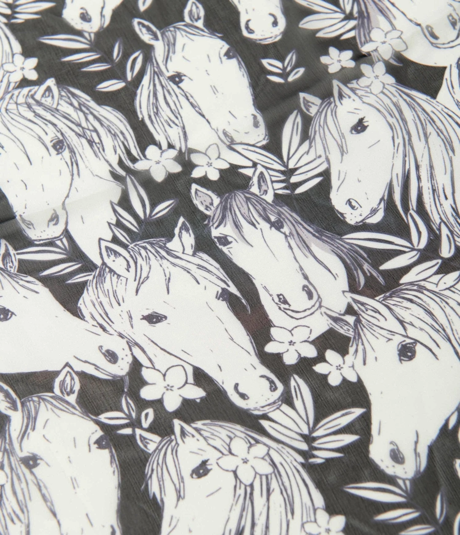 This chic hair scarf is crafted in lightweight chiffon-style fabric that features adorable horses printed throughout a black backdrop.