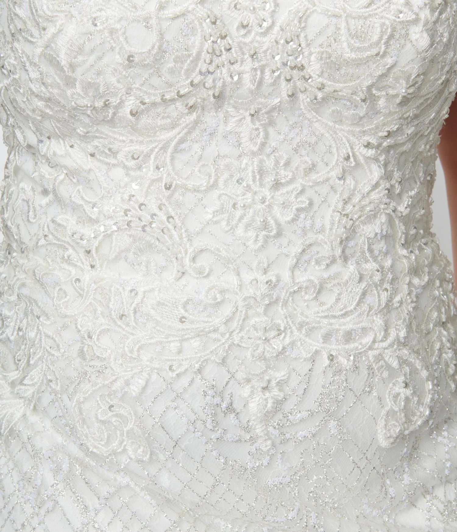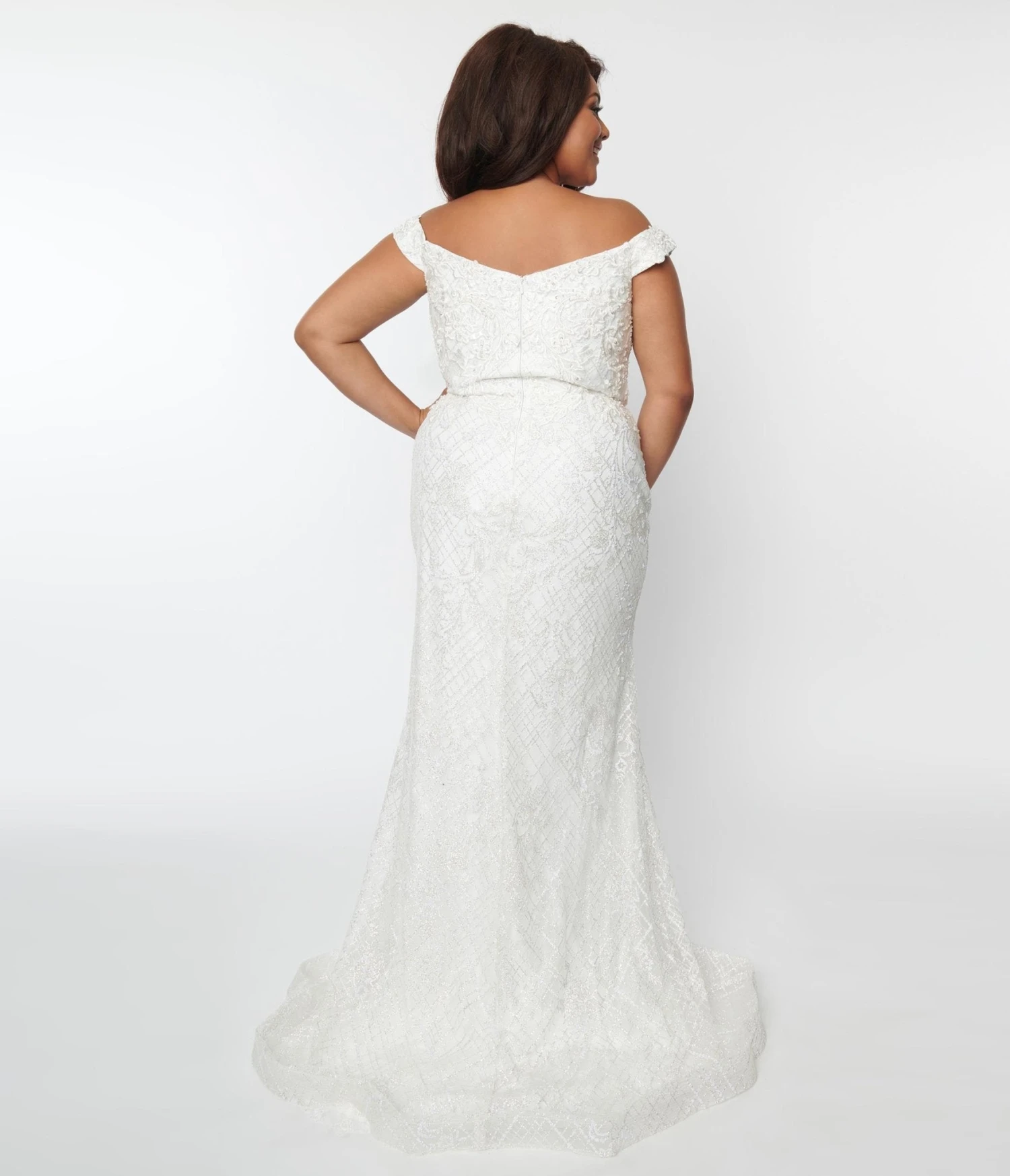 This stunning white bridal dress has lace embroidery in its bodice and showcases an off-shoulder neckline. The garment has glittered pattern throughout for added drama and is closed with a back zipper closure.