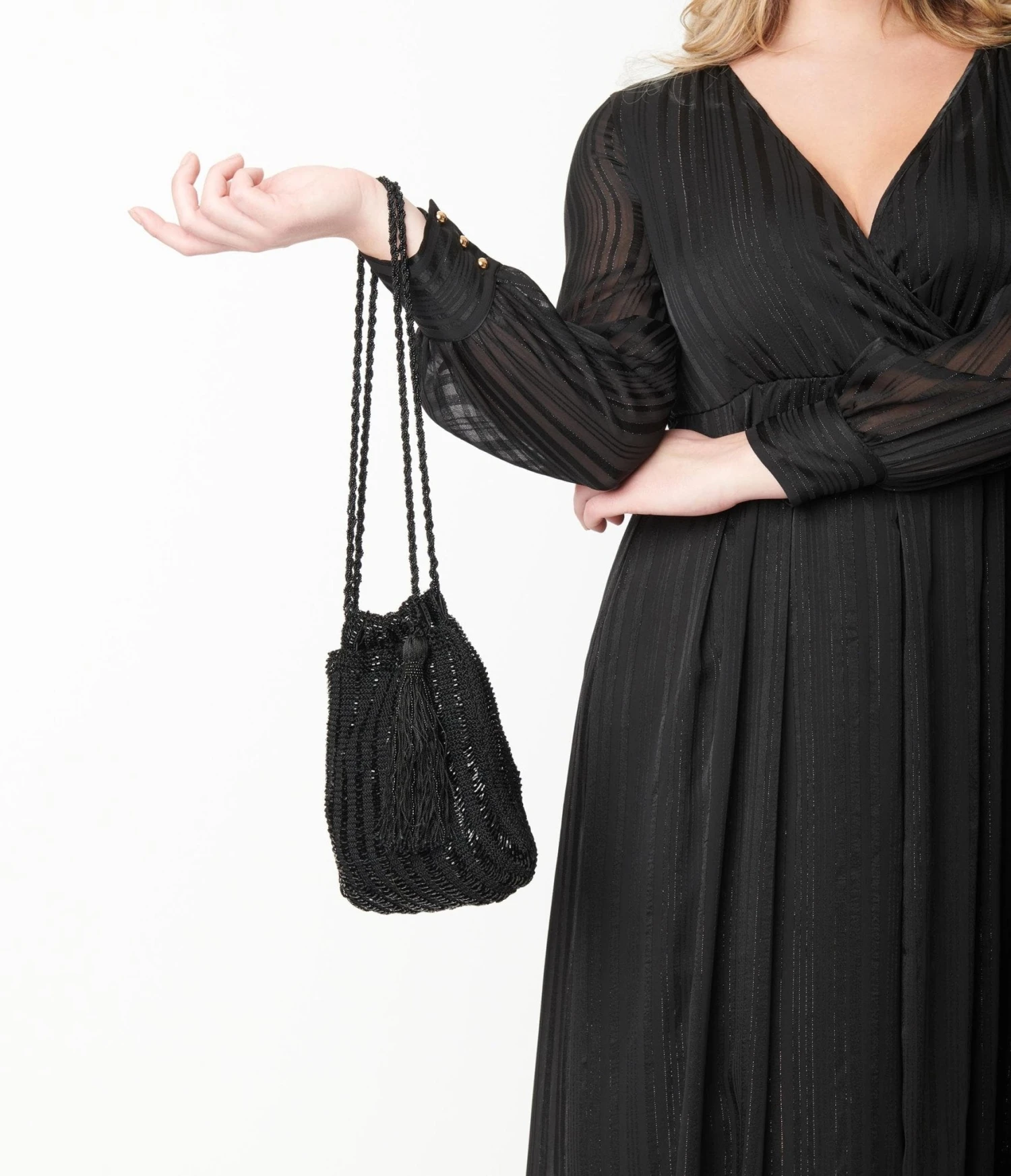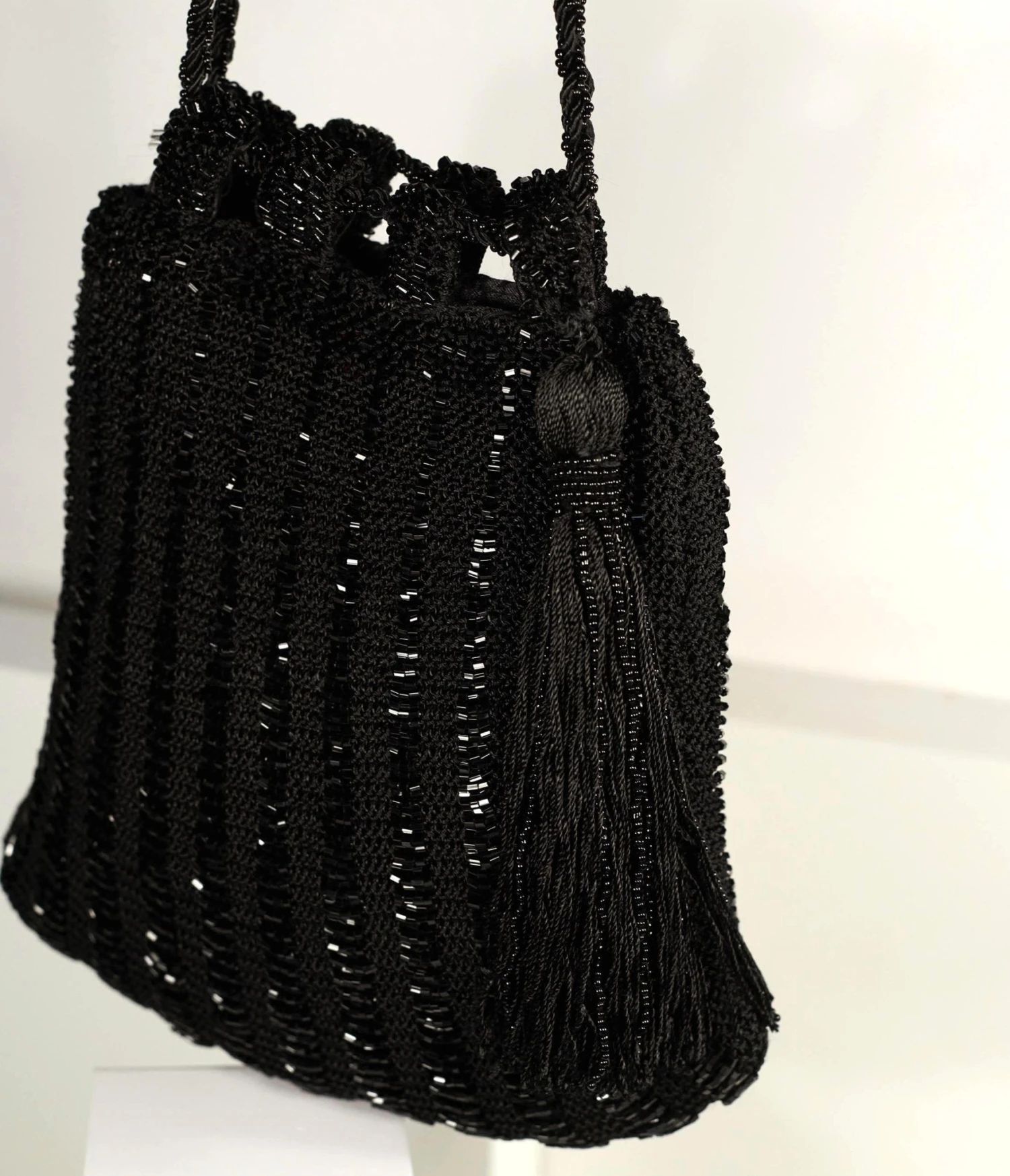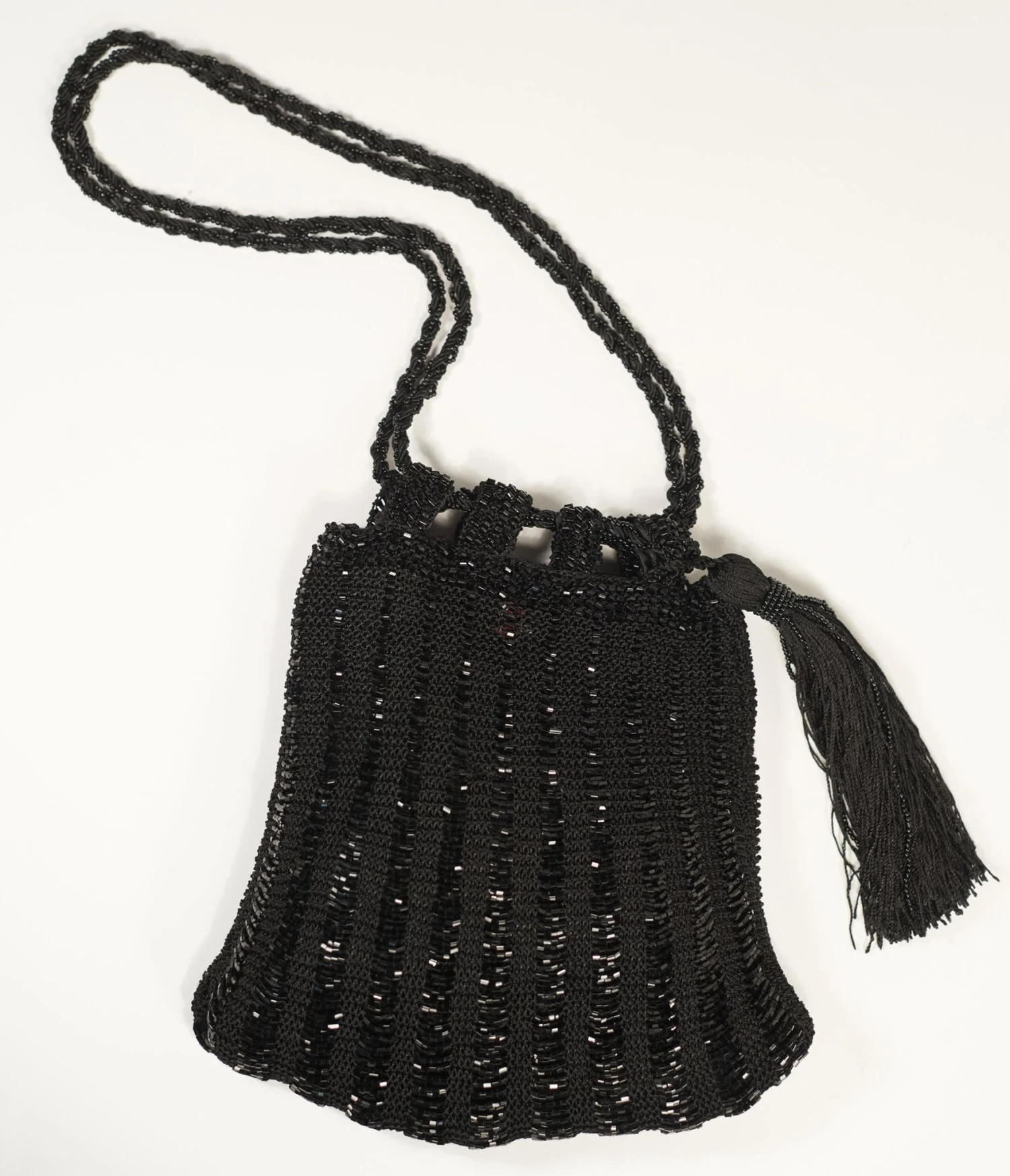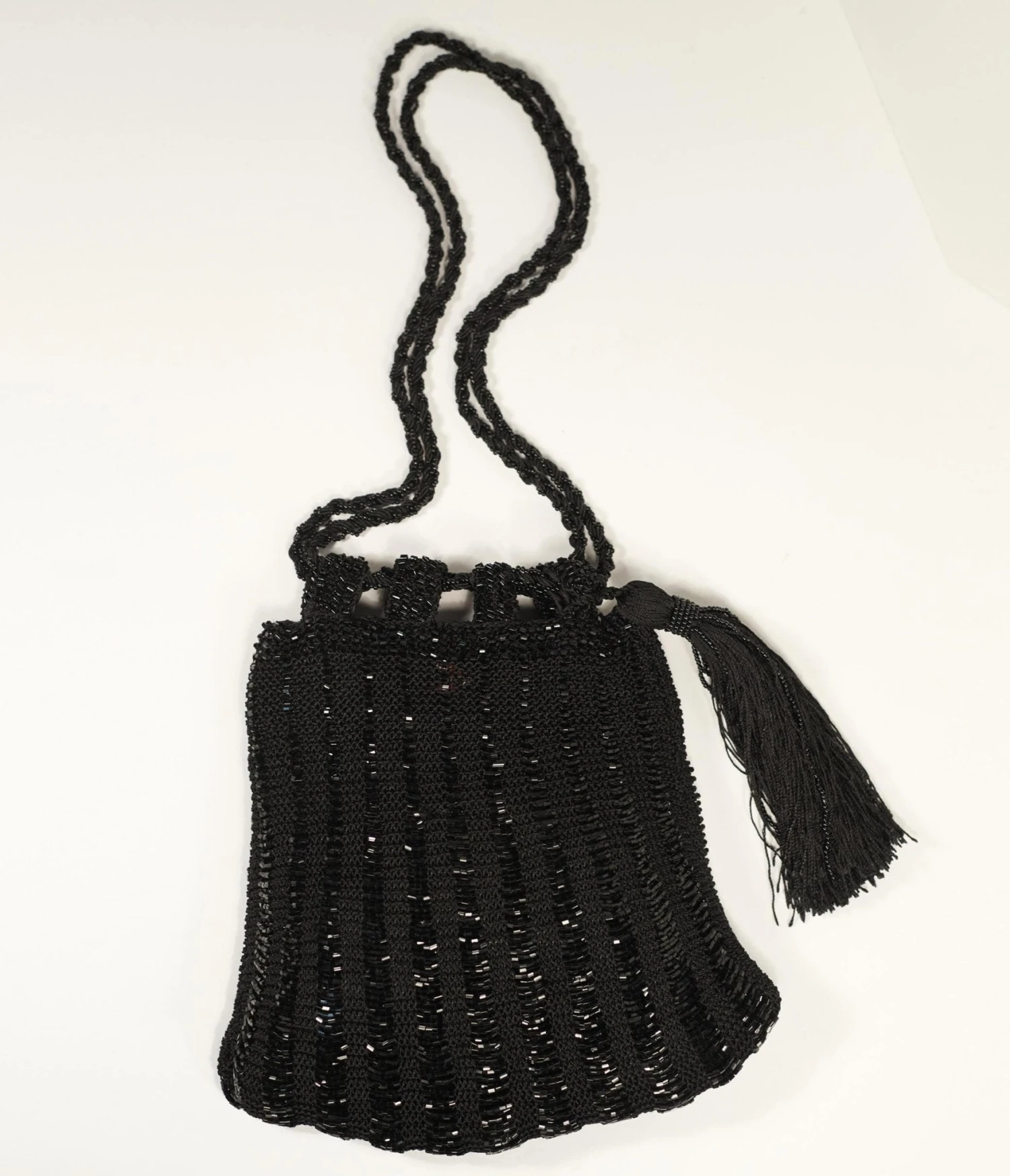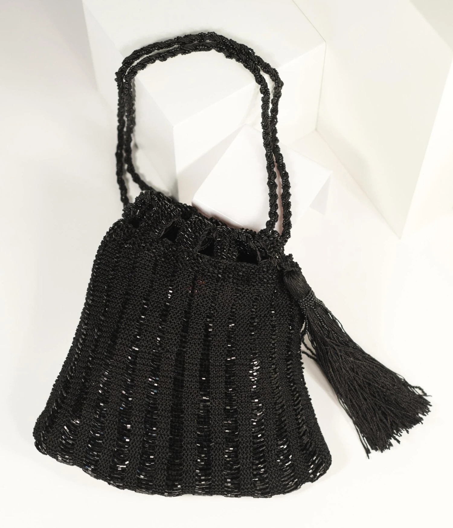 Vintage Style Black Beaded & Crochet Tassel Purse