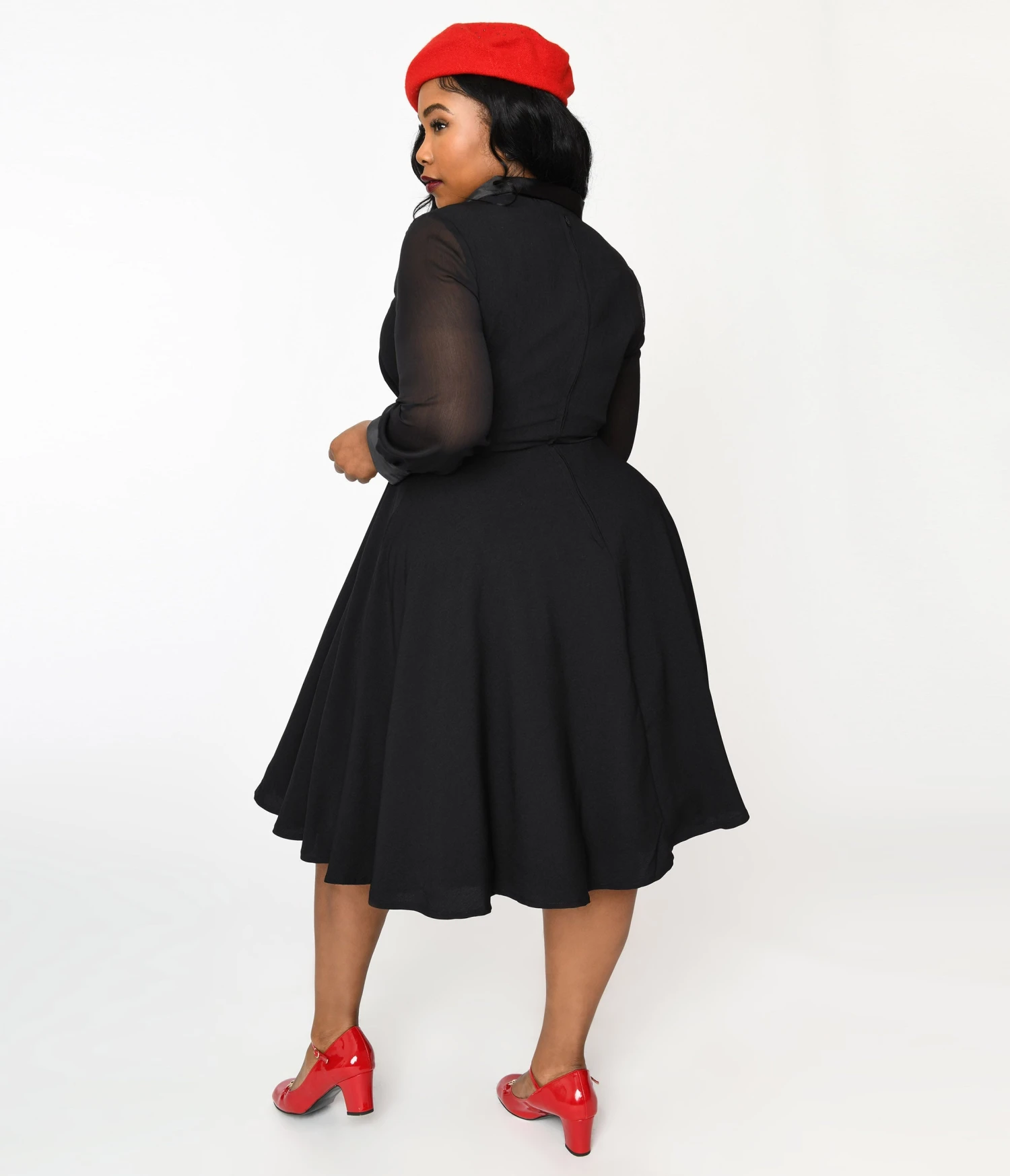 This gorgeous plus size black dress, crafted in a fabulous woven crepe with mid-century satin-like accents throughout. The surplice neckline is embellished with a notched lapel and framed by sheer long sleeves that drop into a button cuff. The banded waist is cinched with a mid back zipper as the sweeping swing skirt is outfitted with side pockets!