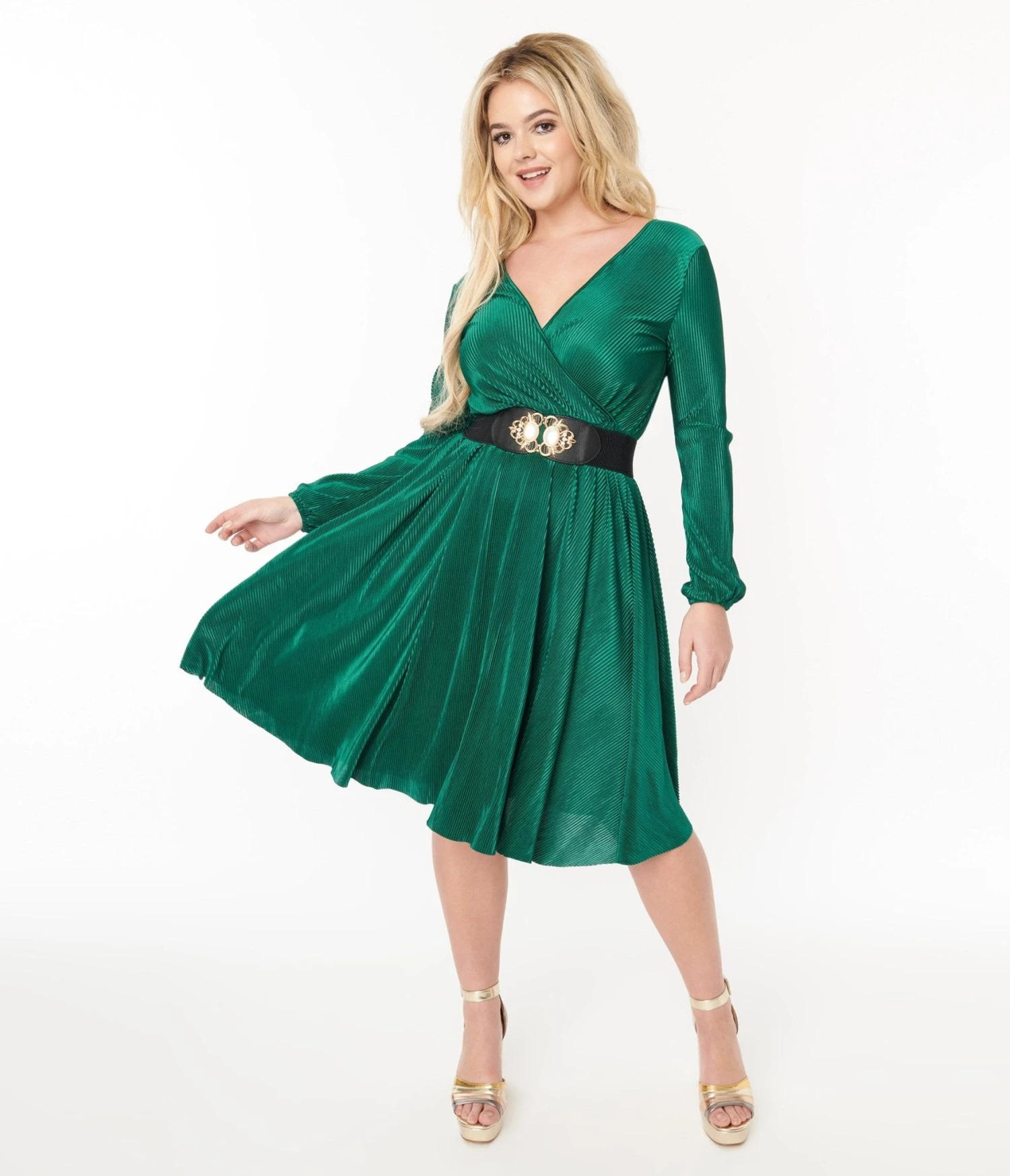 This gorgeous dress from Voodoo Vixen is crafted in a stunning emerald green pleated satin with a surplice neckline framed by long sleeves. Complete with belt included.