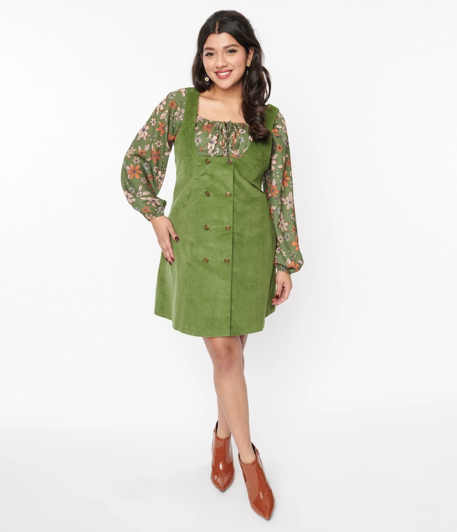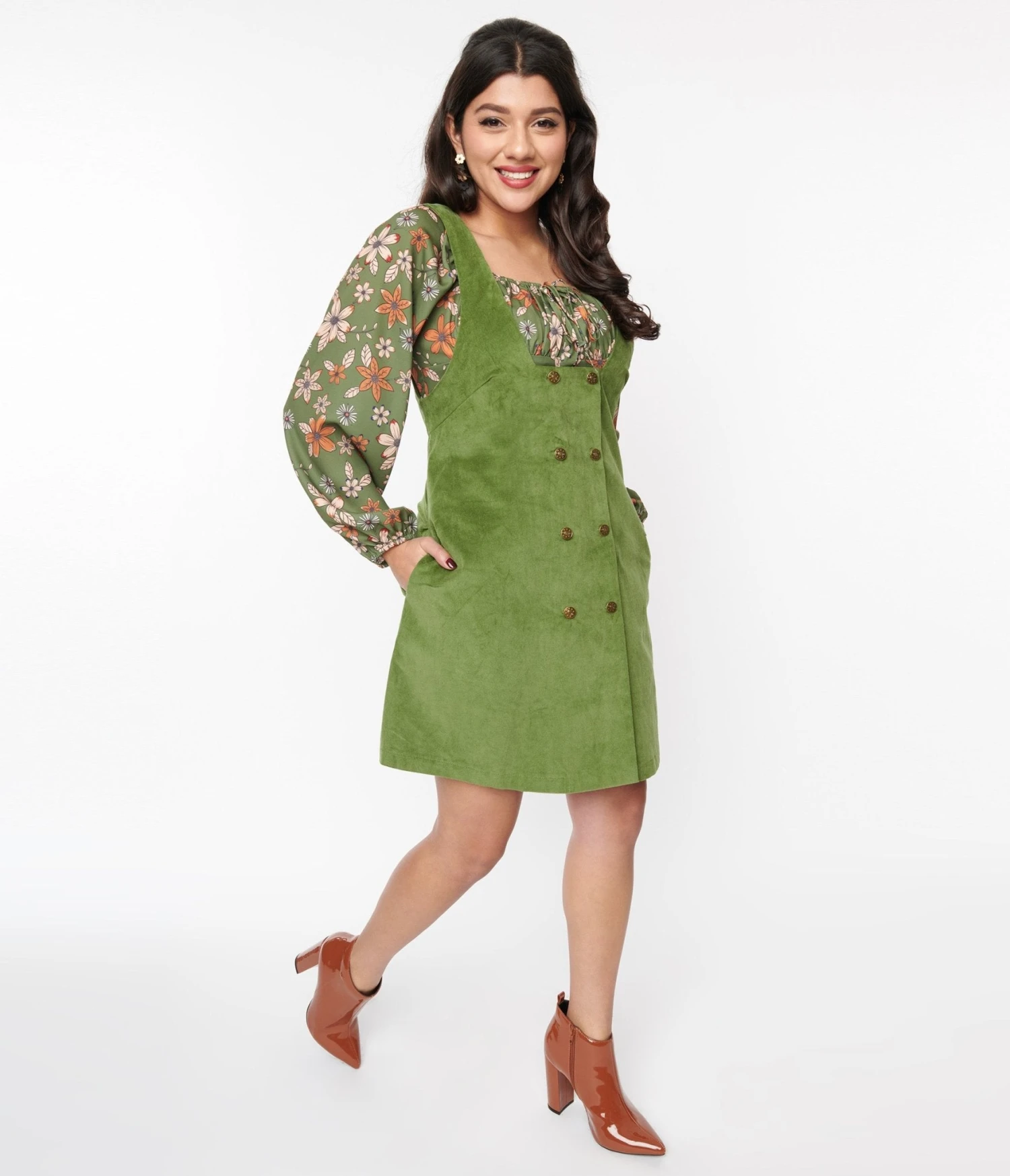 This 1960s style pinafore shift dress is all about embracing your unique style and radiating confidence wherever you go. Crafted from a stunning olive green corduroy, it boasts a sleeveless design and a trendy square neckline that exudes effortless coolness. With its button-up front, this dress adds just the right amount of flirtatious charm to any outfit.
