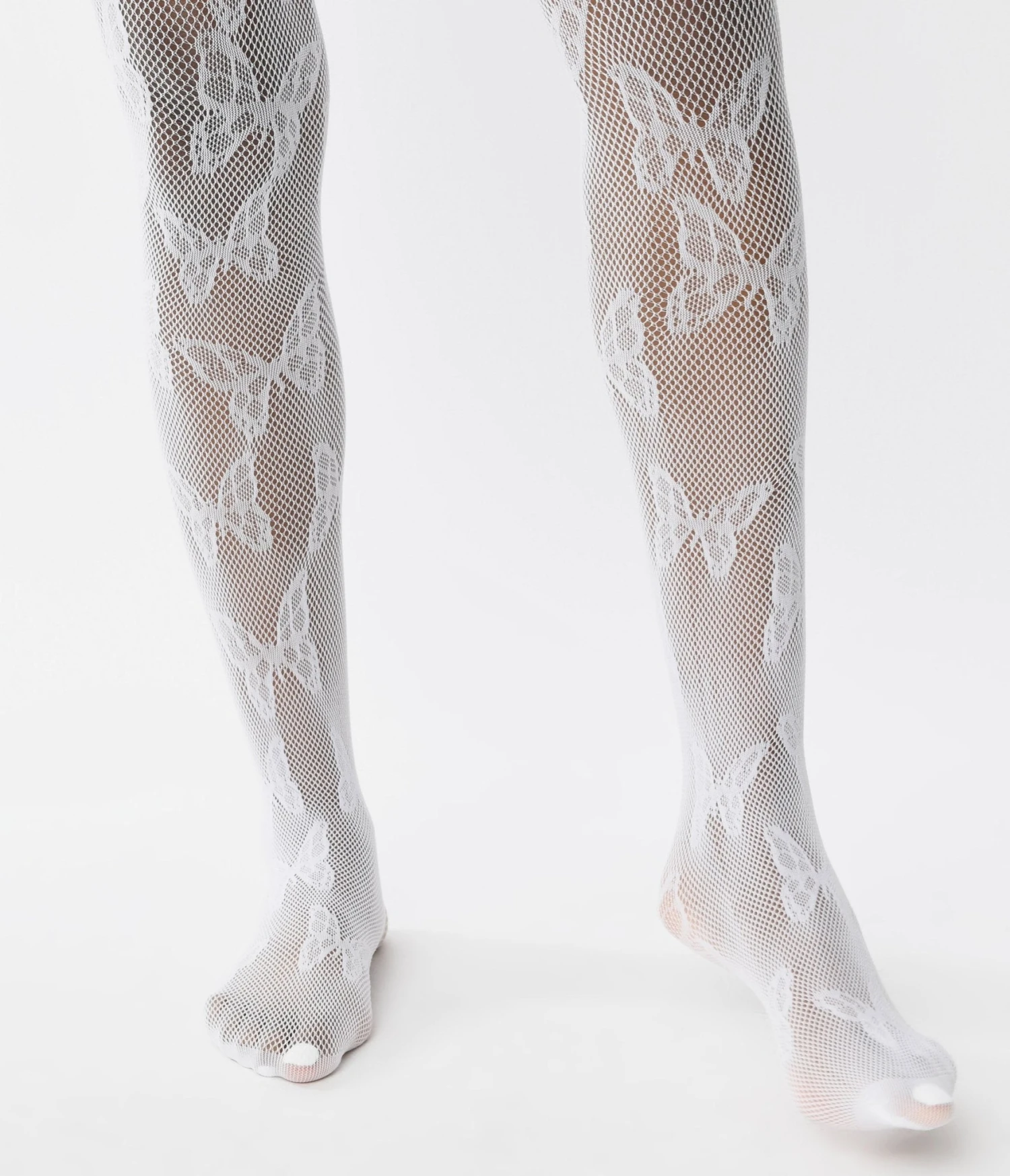 Lovely white fishnet pantyhose with a beautiful butterfly pattern throughout!