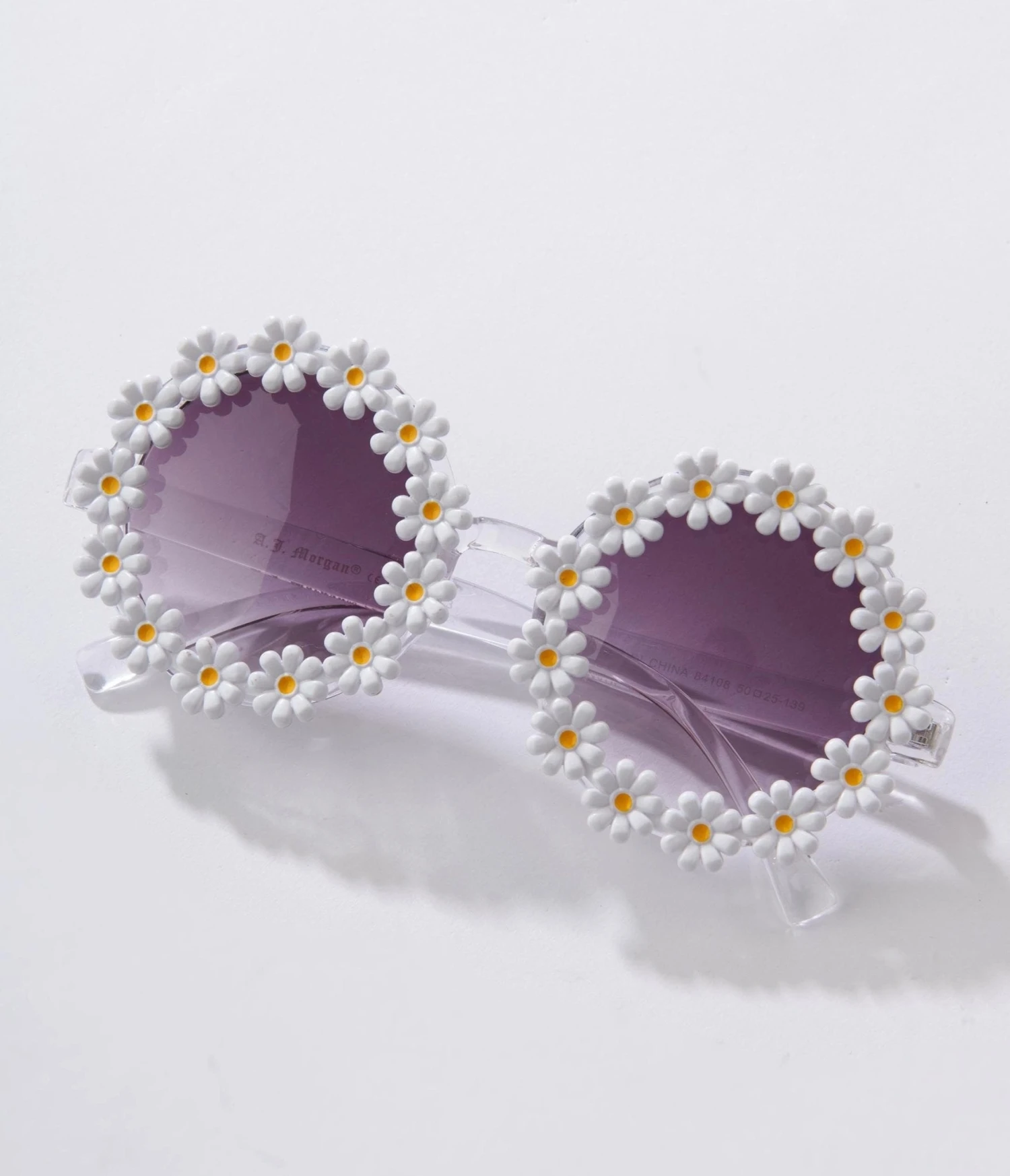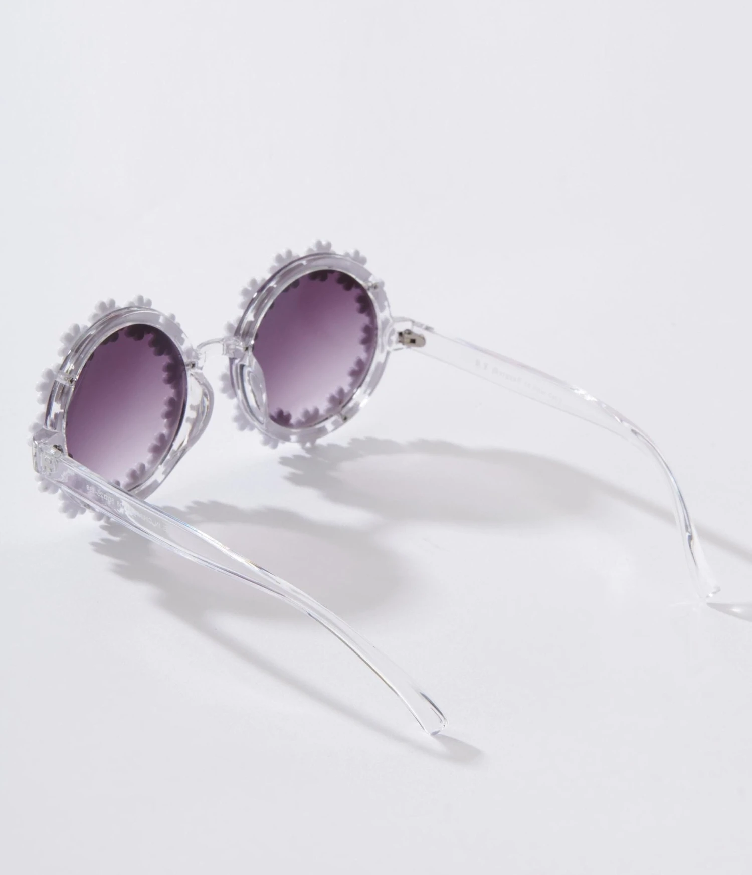Tinted round shaped sunglasses with a white daisy rim. Complete with molded nose and curved arms.