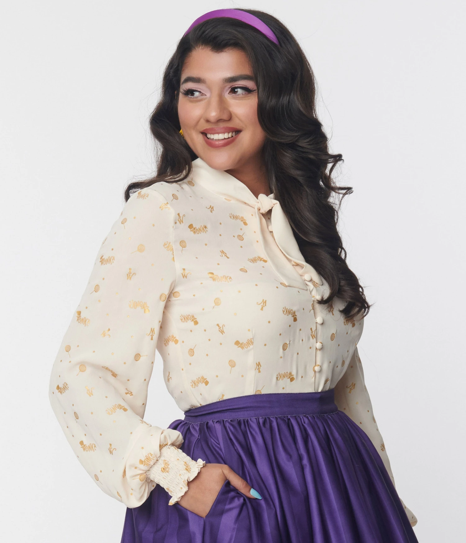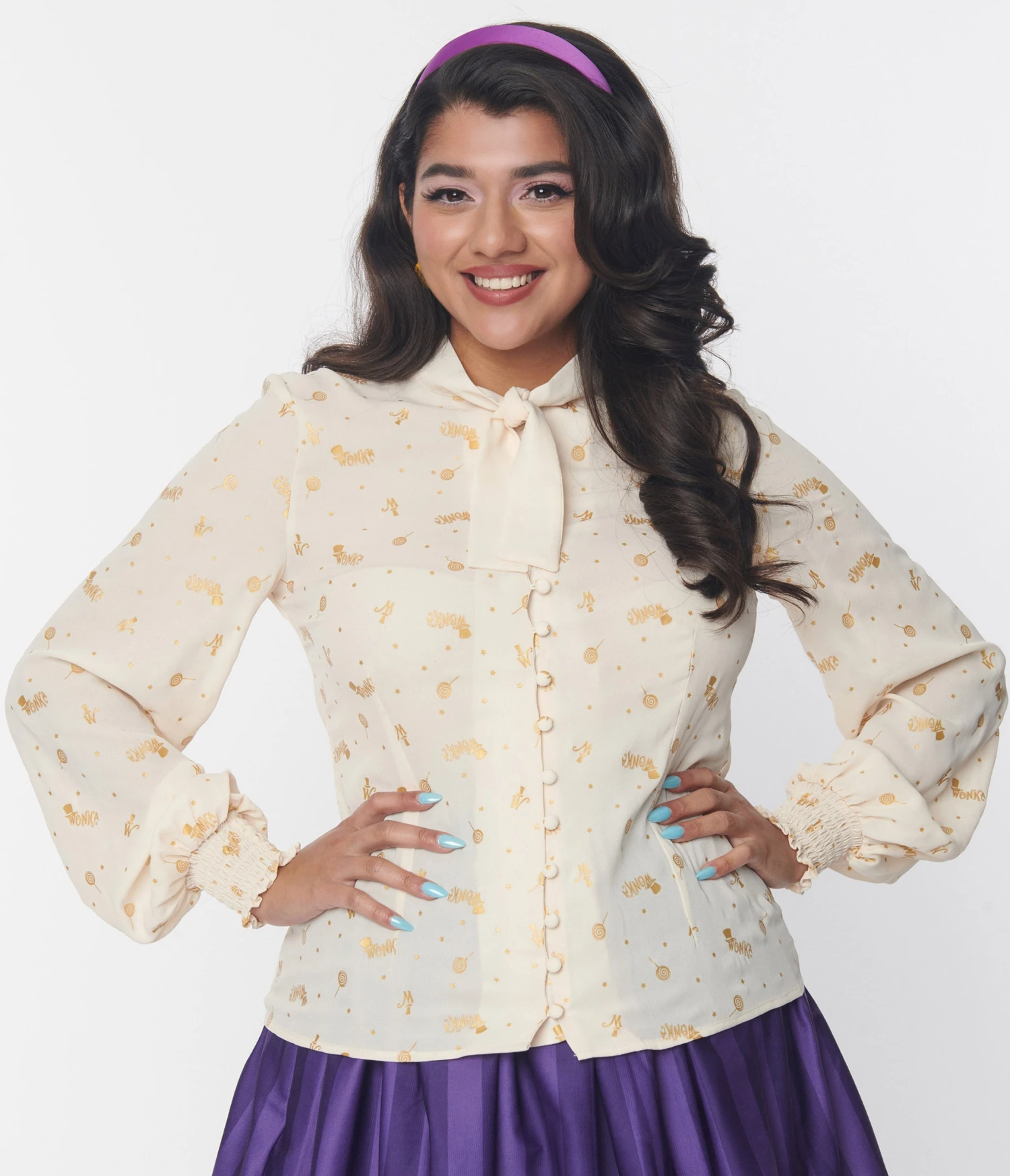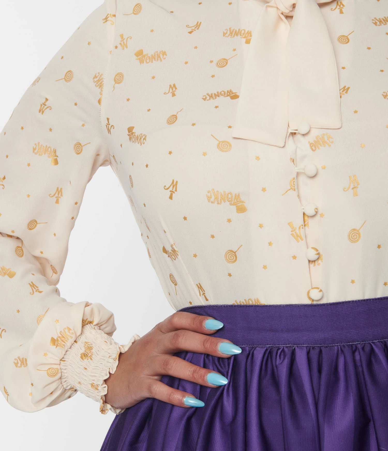 Willy Wonka X Unique Vintage Cream & Gold Neck Tie Blouse Glitter Wonka Print