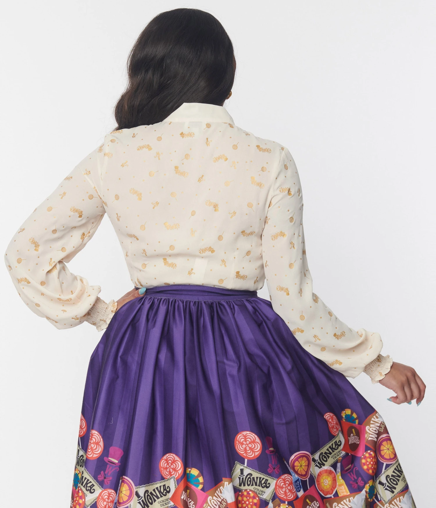 This lovely 1940’s blouse, in collaboration with Willy Wonka, is crafted in a cream lightweight woven fabric that features a glittering gold Wonka logo and candy print throughout. Complete with long sleeves that provide coverage while the self-tie necktie allows for customizable styling options of this charming button down blouse.